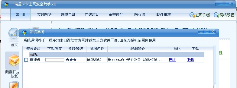 瑞星卡卡扫描到kb952069系統漏洞,可修复结束后重启电脑再扫描还出现同样的漏洞补丁,请问高手如何解决此问题???