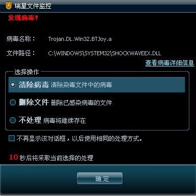 昨天中了Trojan.DL.Win32.BTJoy.a病毒,瑞星杀不掉,每打开一次浏览器,瑞星就弹一次杀毒提示,但是就是杀不掉。请教高手帮忙啊!!!!