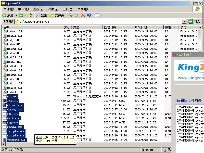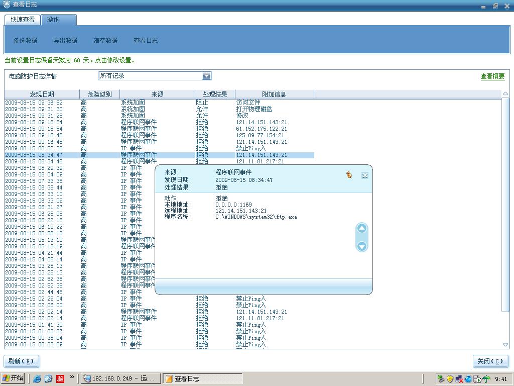 ftp.exe经常要访问网络,瑞星给禁止访问了。曾经用360木马专杀清除了一些文件,然后用瑞星2010全功能版杀毒,没有发现病毒,普通删除只能把1.txt、2.txt删除,无法把cmd.exe何
