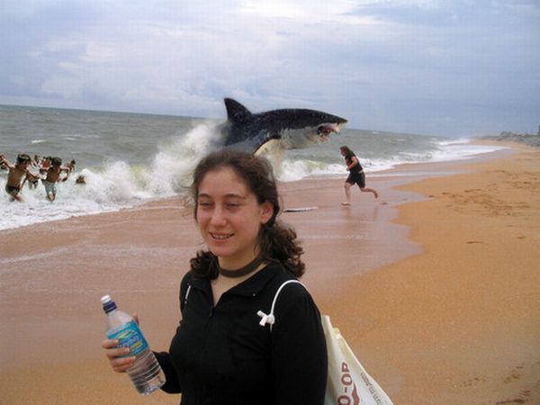 鲨鱼那张明显是PS,岸边鲨鱼早搁浅了。