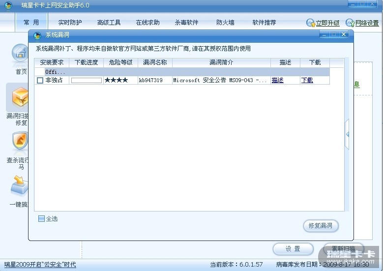 难道KB947319除了重装系统没有别的办法可以解决吗,从此后只要卡卡扫描出什么没法安装的漏洞都要靠重装系统去解决?这个可不是为用户着想的办法啊。