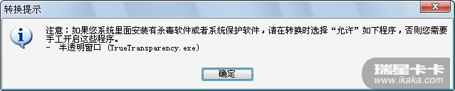 谢谢大家的帮助,我自己找到了原因,是应为我的一款安全软件绿鹰安全精灵的拦截,瑞星没有关系。为了证明我将绿鹰安全精灵的监控关闭,就能够使用半透明窗口程序。