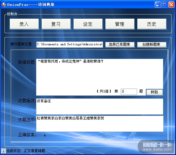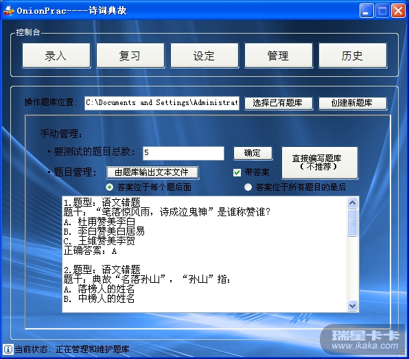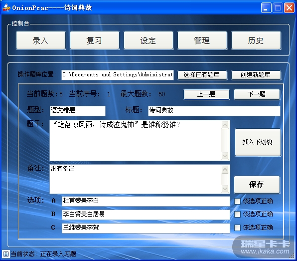 更新了Build7,新版build8正在酝酿中。预计更新一个读取预制文件,来自动载入一些配置,达到用作考试系统的目的,并把选择题选项增加到4个(原先一直是ABC的),更改一下图片存储的绝对路径的方式和答题环境。
