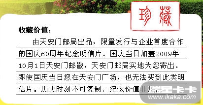 天安门邮局发行的限量版国庆60周年明信片一张注:非在线产品不参加本次活动!收藏价值: