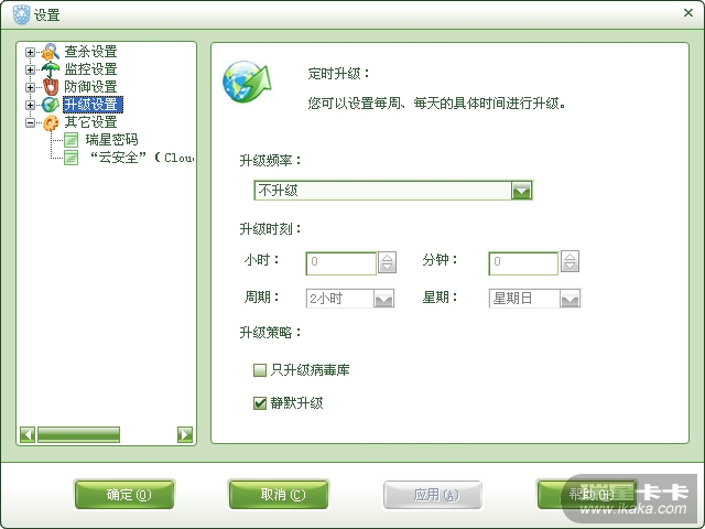 手动升级肯定是可以看到升级画面了(除非勾选隐藏升级窗口),默认升级策略是静默升级,升级频率是即时升级,杀毒软件会在后台静默升级,也就是看不到升级画面。