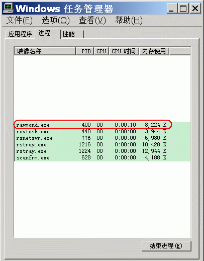 问题原因:Rav2009 的RavmonD.exe 组件(参见“任务管理器”截图)可能被一特殊消息触发而自行关闭,