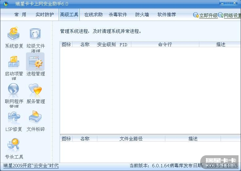 我的卡卡中的进程管理栏目中没有任何进程文件,重新扫描过还是这样(空白显示)。我查了毒,没有毒。重新安装卡卡,还是这样。