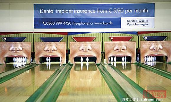 在保龄球球瓶摆放口贴上一张人嘴图片,保龄球瓶就变成嘴里的牙齿整齐地排列着,剩下的,就是把它们打掉了。这是一家卫生机构和保龄球馆合作制作的宣传牌,目的是让人们更关注牙齿健康。值得一提的是,这家机构也提供补牙服务。