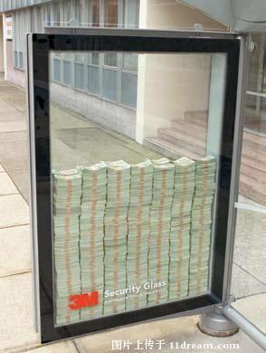 在加拿大范库弗市(Vancouver)的不少公交车站旁,都摆着个玻璃制成的扁箱子,里面装的是:钞票!钞票货真价实,金额巨大,而且,只要你能把玻璃打破,这些钱你就可以通通拿走。猜出来了吧?这是安全玻璃厂厂家的广告。据说还真没人打破过这些玻璃呢。