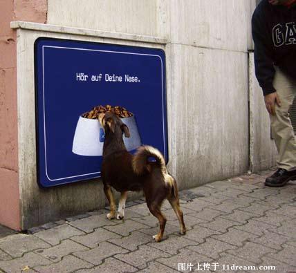 光靠视觉刺激还不够,我们需要全方位地打动消费者。德国一家狗粮生产厂家在招贴画颜料中添加了狗粮香料,结果……狗真的被引来了。接下来就该主人掏钱了。