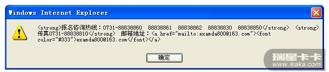alert('<strong>报名咨询热线:0731-88838860 88838861 88838862 88838830 88838850</strong> <strong>传真0731-88838810</strong> 邮箱地址:<a href="mailto:examda800@163.com"><font color="#333">examda800@163.com</font></a>');