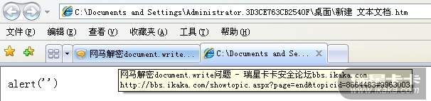 解再到这里,把document.write改成alert,然后保存后缀名为htm格式的,但是不知道没有解析出网马地址来,我认为这个代码有可能不完整,但是不知道怎么往下做,希望networkedition指点