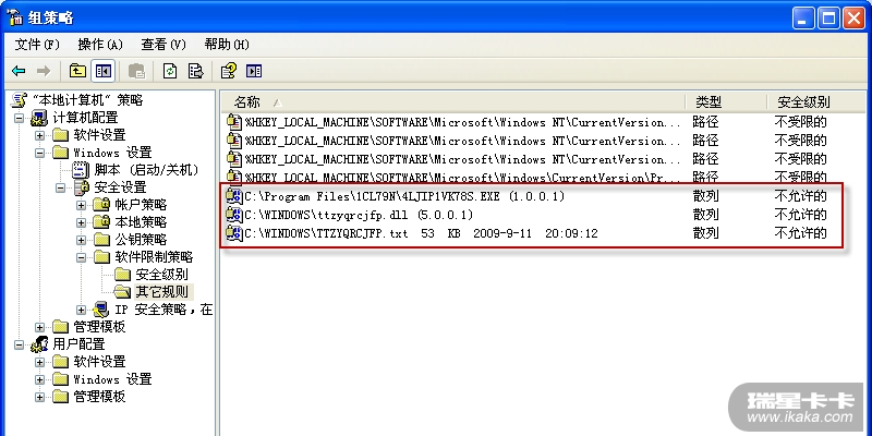 尽管如此,通过实机运行观察此样本,还是发现了这个病毒的软肋————手工杀毒前务必先断开网络;然后用组策略中的软件限制规则(散列规则)禁止下列病毒程序运行: