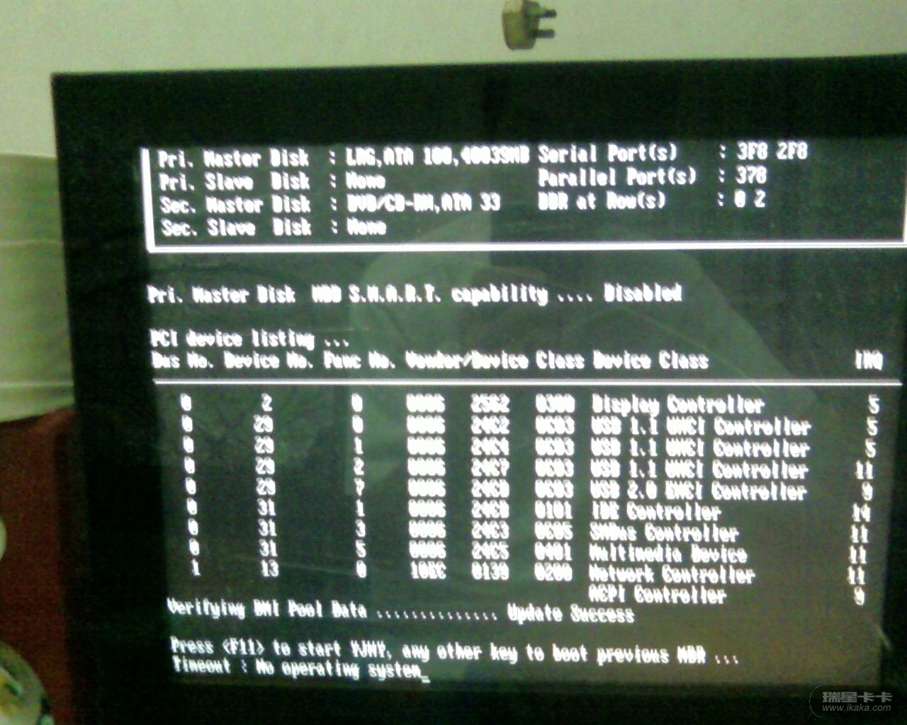 如果我们在启动计算机时看到上述这个信息后,系统长时间停止不前或处于死机状态,对于机器此类故障一般很难处理。因为不能像进入系统后出现的故障,我们可以检查系统日志之类的文件进行分析。不过,根据PC机启动的过程原理分析,出现这条信息时一般有以下的可能情况: