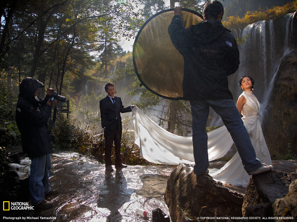诺日朗在藏语中是高大雄伟的意思。在海拔7700英尺(2350米)处,九寨沟的诺日朗瀑布在清晰的山谷光辉中层叠直下80英尺(24米)。这为婚纱摄影提供了相当恢弘并且大受欢迎的背景。