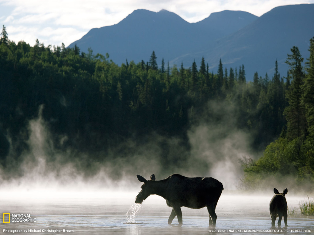 清晨,北美麋母子来到了不列颠哥伦比亚省梅菲尔德湖的浅滩。梅菲尔德湖地区拥有丰富的物种系列,其中不乏多种大型哺乳动物,是探寻野生动物世界的一个独一无二的窗口。“几乎没有道路通到这个区域,人类难以涉足,动物却来去自如。”北不列颠哥伦比亚大学的野生生态学教授凯茜·帕克说道。一个相对封闭的区域有利于保持原有生态系统,使生活在此的动物在食物选择和迁徙方式上保持灵活性。“梅菲尔德湖区的动物仍有很多的选择,”帕克说:“这使得动物们不必拘泥于一种生存策略,这对其长期生存和繁殖意义重大。”