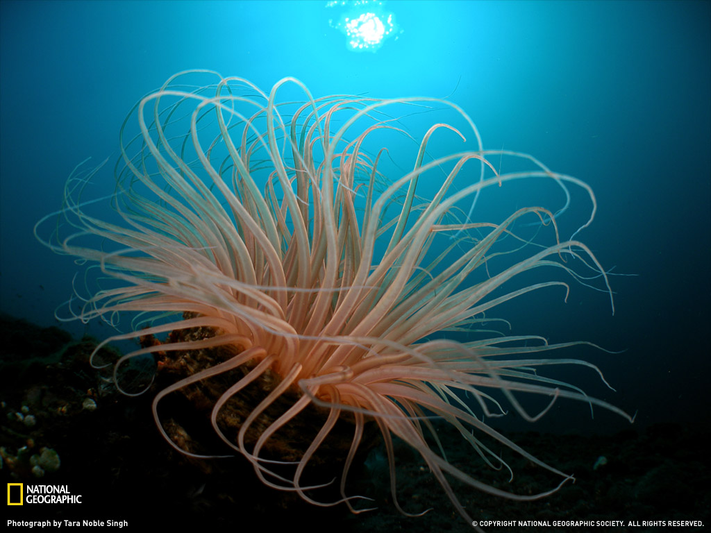 本照片摄于巴厘岛的图兰奔,这只硕大的角海葵挺立在黒砂海底之上,使我能够从下仰拍到它令人惊叹的触手,并抓拍到其优美的动作。闪光灯使海葵本就耀眼的光芒更加夺目,而落日的余辉则为此平添了几许氛围。