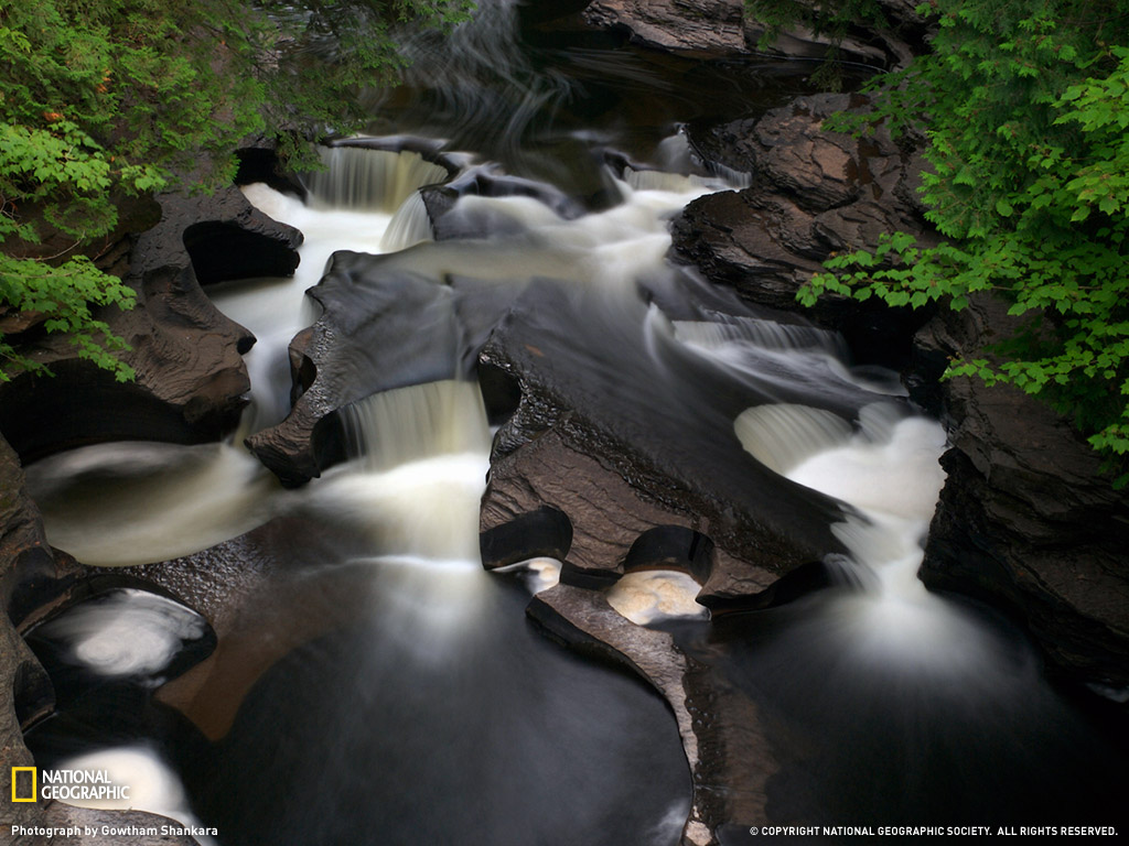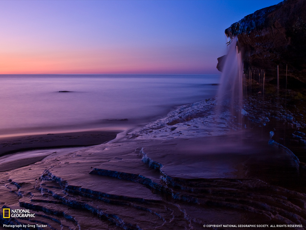 30秒的曝光捕捉到了位于国家湖岸岩石的泻入苏必利尔湖的一个小瀑布。