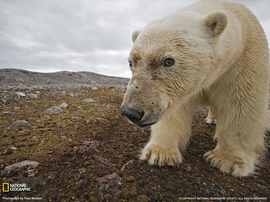在挪威位于北极区的斯瓦尔巴群岛,一架隐蔽式自动相机抓拍到一头在裸露的棕土上四处张望的北极熊。