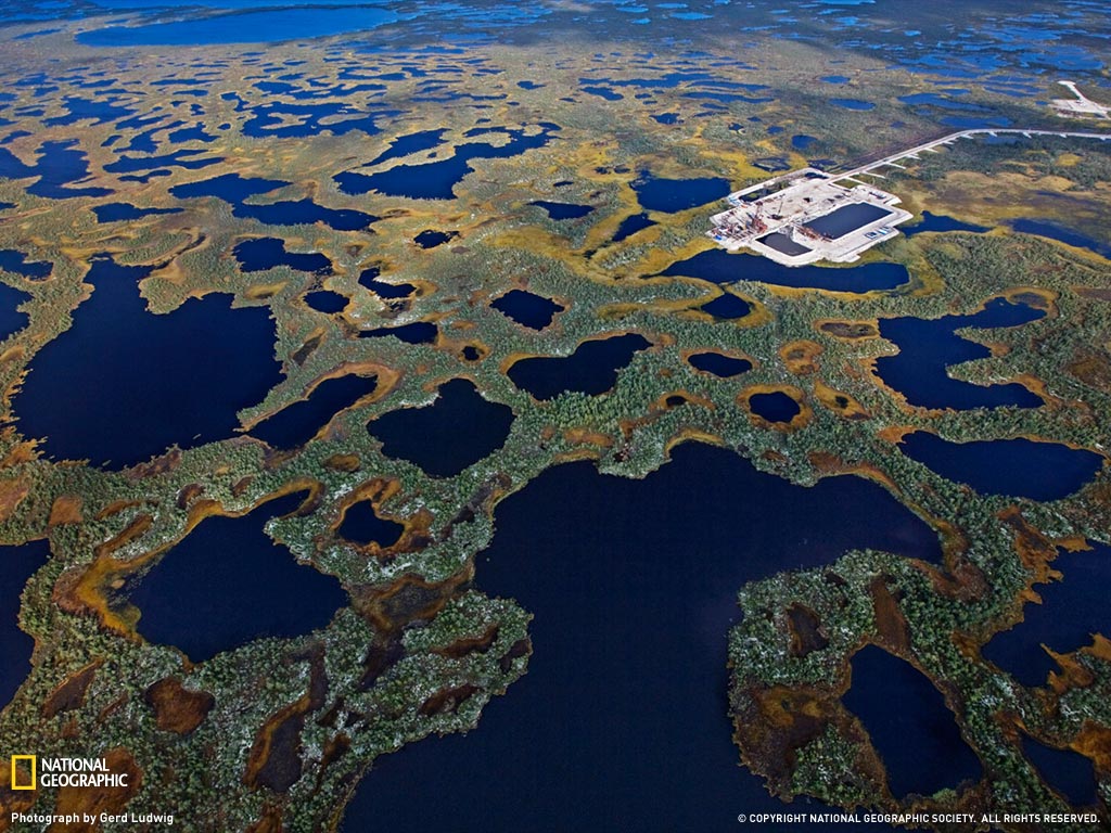 一个钻井平台建在脆弱的湿地上寻找新的石油储备。从西方输入的技术促进了俄罗斯石油工业的现代化,不过苏联时期的石油泄露及管道破裂已经污染了这里的大部分区域。