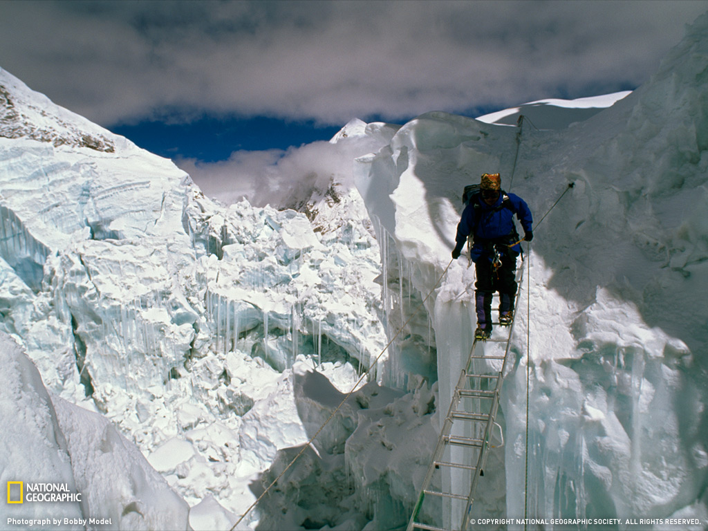 在尼泊尔的珠穆朗玛峰上,名为尼玛·多杰·塔芒的夏尔巴人正在横越架在孔布冰川上的梯子。“到处都令人害怕,这里是珠穆朗玛峰南端路线上最危险的路段。不断偏移的恐怖冰川就如同一大堆冰块组合而成,而这些冰块不断地沿着冰山的峭壁翻滚而下,”摄影师Bobby Model 说。