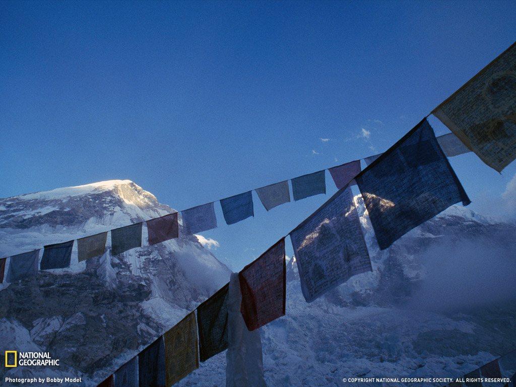 悬挂的经幡旗穿过珠峰大本营(Base Camp)努子峰则在远处隐现。每年,来自全球各地的攀山者都会从这里出发,示图征服珠穆朗玛峰——这座全世界海拔最高的山峰。