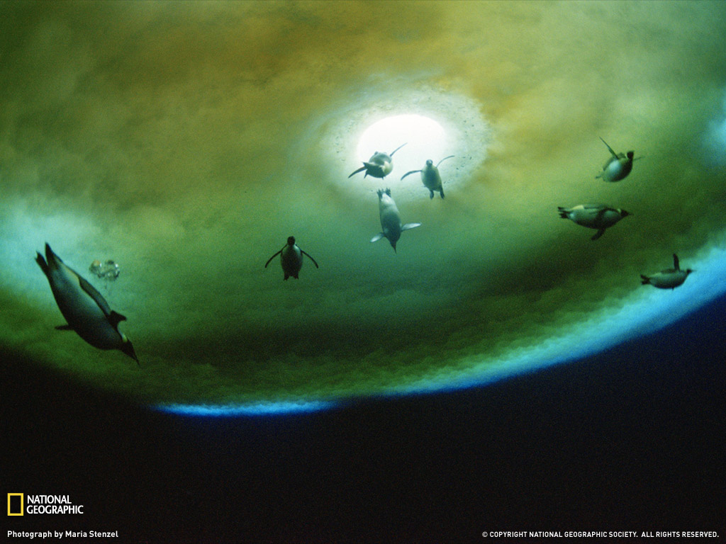 在南极洲,企鹅们正透过一个气孔游近水面,这是由一具遥控水下摄影机所捕捉到的镜头。