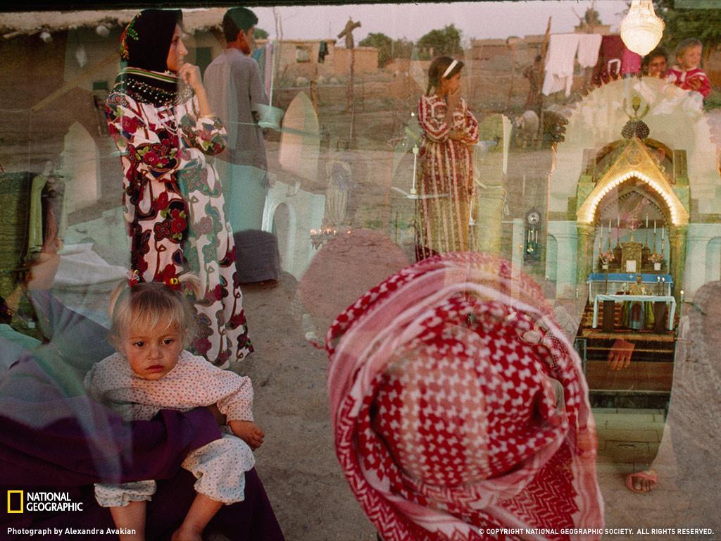 1999年5月伊拉克尼姆鲁德附近:这张双重曝光的照片展示了一个穆斯林家庭在一天结束时休息的场景以及一座天主教堂Karakosh al-Taheram的景象。