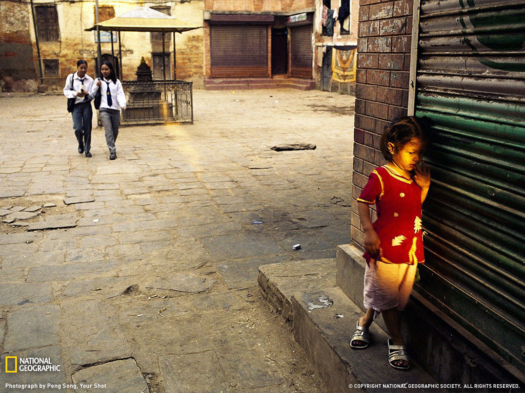 在新西兰的库克群岛,一名小女孩在前往教堂礼拜时迟到,不安地从门外向内窥探。