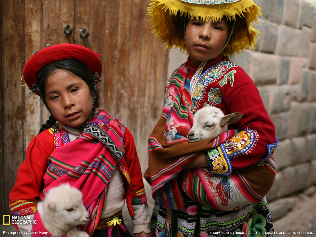 穿传统服饰的两个秘鲁小孩抱着小羊羔,并为拍摄肖像照摆好了姿势。