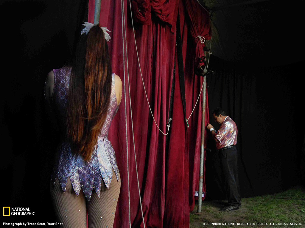 马萨诸塞州的一个家庭巡回马戏团内,父母看着他们的女儿在台上的表演。