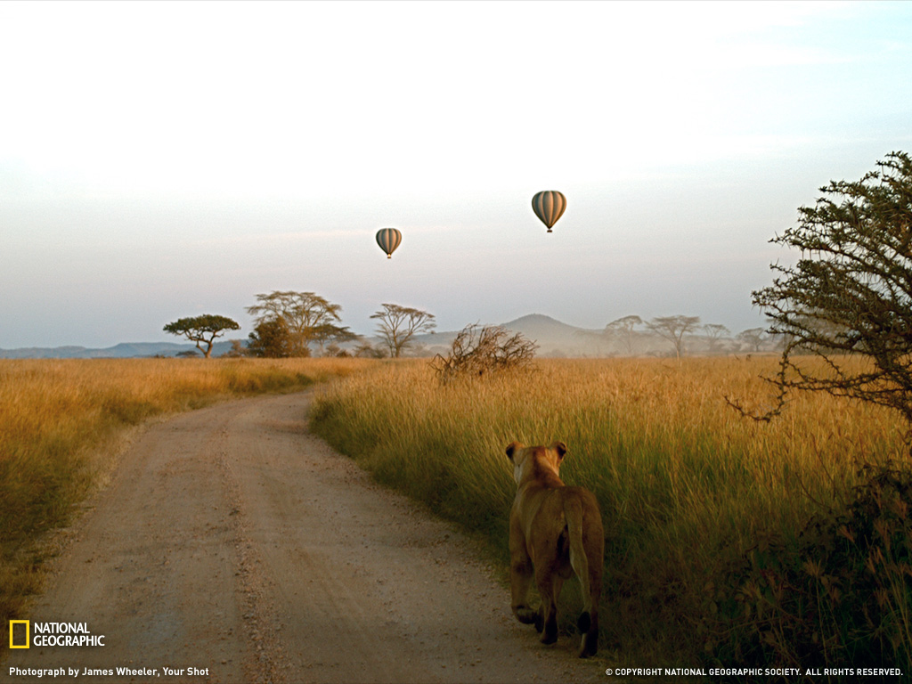 坦桑尼亚)开着汽车跟随由受雇的驾驶员驾驶着的商业热气球时,我们发现我们不是关注天空唯一的人。这只母狮子在我们前面不紧不慢地移动了好一段距离,后来她转身看看我们,几秒钟后就完全消失在附近的树丛中。