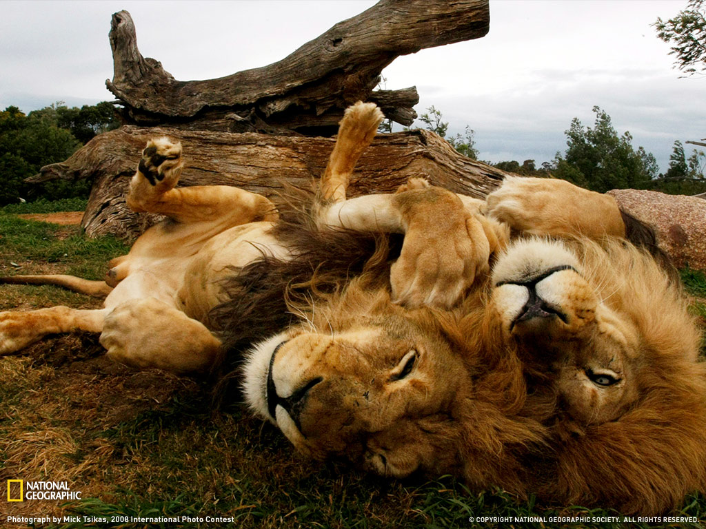 2008年9月,在位于澳洲墨尔本西部30公里(19英里)的威勒比开放式动物园里,一对十二岁的狮子兄弟正相依相偎地躺在一起,左边的叫托尼,右边的是托波。威勒比开放式动物园拥有225公顷(556英亩)的面积,游客们在那儿可以坐在观光大巴里近距离接触动物。这张照片是通过一个隐藏的远距离触发式相机拍摄的。