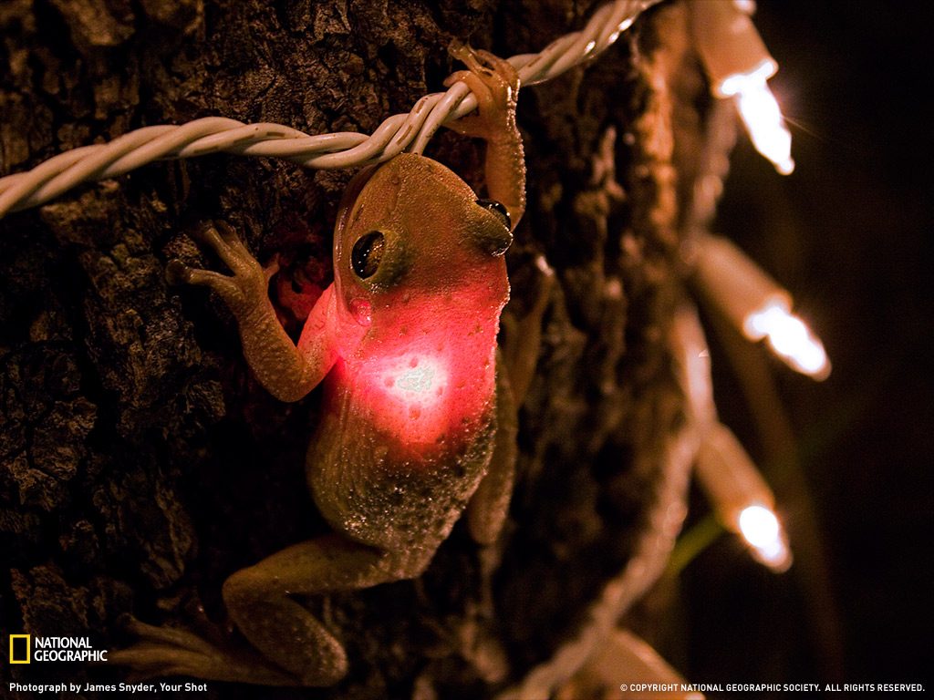 这是一只趴在我佛州南部家中后院树上的古巴树蛙。它是因何以及怎样吞下这只灯泡的仍旧是个谜。需要说明的是,在我准备拍摄它时,我以为它己经被体内的灯泡烤熟了。我庆幸自己想错了,在我拍了几张后,它竟然调整了一下位置。当我拍完后,我从它的嘴里把灯泡给取了出来,它依然安然无恙。也许这个举动有点疯狂,事实上,它可能并不情愿我“抢走"它的灯。