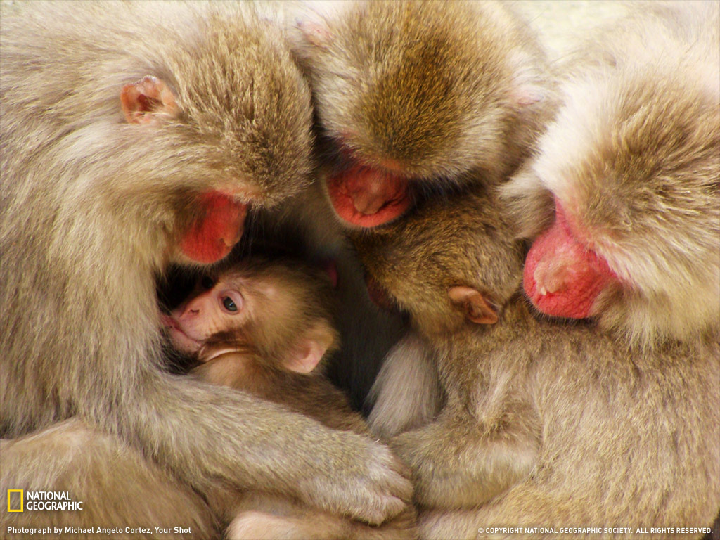 一家老小相拥在一起。这张照片显示,猴子或许比人类拥有更加紧密的家庭关系。