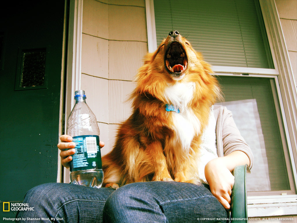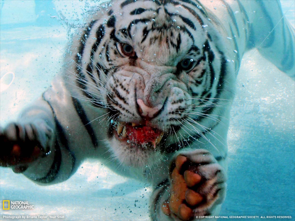 我于2004年在加州委利贺的六旗海洋世界拍下了这张照片。当时驯兽师把肉扔进了小水池里来展示老虎的跳水才能,这只漂亮的动物正好盯着我的镜头。它脸上的怒容并非是由于厌恶或是生气,恰恰相反,是由于这个大型猫科动物要皱起它的鼻子来防止呛水。