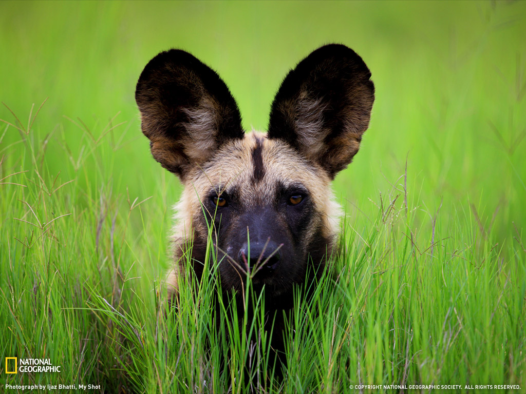 图为一条在高草丛中凝视的野狗,博茨瓦纳。