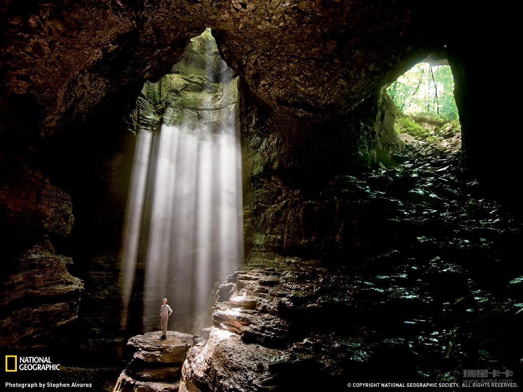 在亚拉巴马州,即使是探穴新手也能从两个洞口轻易进入斯蒂芬斯裂谷岩洞:从右边的洞口拾级而下,或者从左边的洞口垂绳而入。这一块阳光照射的基石离洞底足足三层楼高。