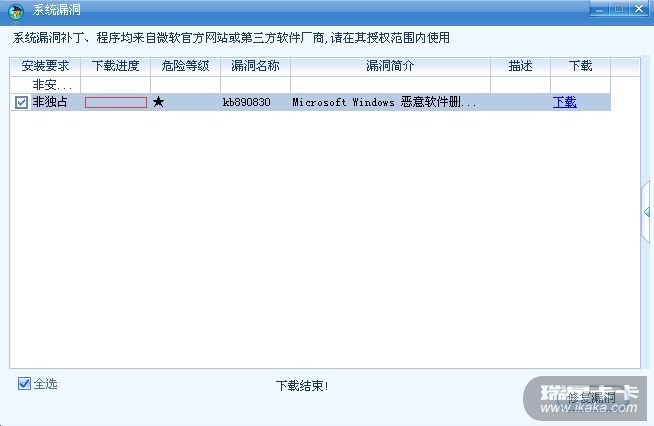 我的卡卡每天都会检测出一个系统漏洞,点击修复后却每次都没有修复好,只是显示下载结束并不能安装,如何能够解决啊?每天都弹出检测到一个系统漏洞的小窗口甚是烦人。