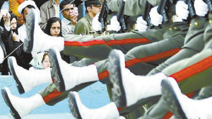 看谁走不齐2008年4月17日,德黑兰,伊朗人观看建军节阅兵式