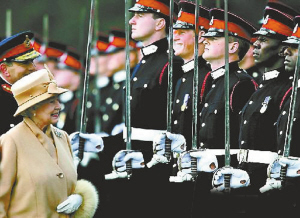 看谁憋不住 2006年4月12日,桑德赫斯特,英国女王伊丽莎白二世和站在阅兵队伍中的孙子哈里王子(右四)忍不住会心微笑
