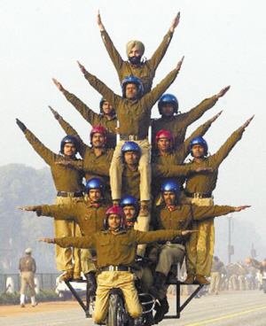 看谁难度大 2004年1月12日,新德里,印度摩托表演队的士兵进行国庆演练?