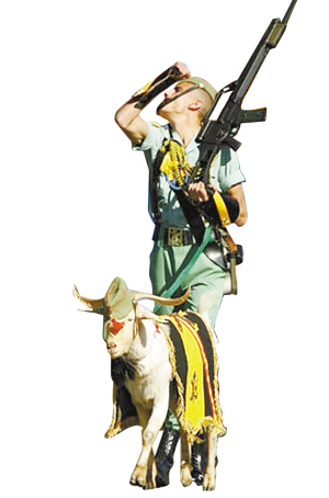 看谁更帅气 2008年10月12日,马德里,西班牙军团士兵牵着自己的羊,参加国庆阅兵式。