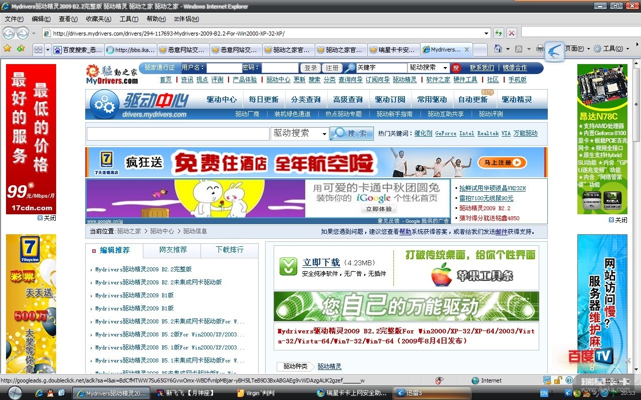 http://drivers.mydrivers.com/drivers/294-117693-Mydrivers-2009-B2.2-For-Win2000-XP-32-XP/ 以上URL为驱动之家网站下载地址,所附JPG图像为该广告的宣传图片,所下载下来的程序不光恶意修改IE,导致我再次重新做系统,下载了很多IE修复软件都不行,请问驱动之家:做为一家大型的门户网站里的广告确包含病毒到账用户重新做系统,请问这算什么意思?为了赚钱?连网友的电脑安全也完全不顾忌了吗?