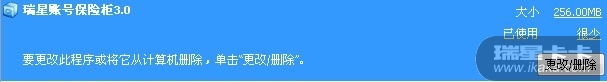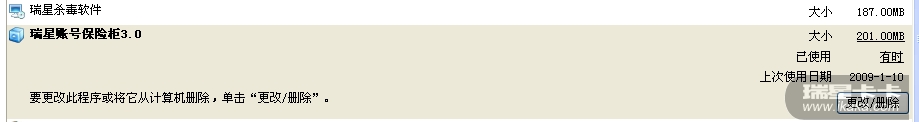 最近无意间看到控制面板里面的添加或删除程序里面的瑞星帐号保险柜的大小是201MB而瑞星杀软09的大小只有187MB怎么会出现这情况啊为什么杀软的大小还没一个组件大容量大啊不过说了上图