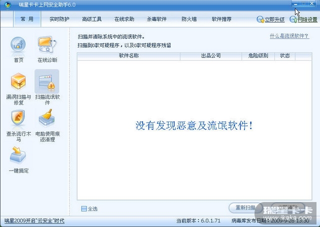 谢谢斑竹对俺的关心!由于电脑不能正常上网,迟迟没看到版主的帖子。可是俺不得已,首先用系统盘修复,还不行只能Ghost镜像了!可惜不少软件又要重新安装很是麻烦。当初俺怀着对瑞星的信任,也是支持民族产业。俺花了200大洋买了瑞星,近三年了,实在不堪瑞星的弱智,N次Ghost系统了,实在不堪其扰。不得不对瑞星说:你太无能了,只能扔掉你了!现在俺换了卡巴套装2009了。初步使用感觉很好!从俺机子里查处了近30个病毒,以木马为主,而且还包括三个没解压的.RAR文件。真是太强了!