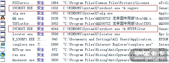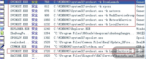 用卡卡的进程查询工具,看看svchost下面挂了些什么