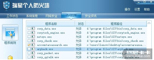D:\Program files\123 下,有arphack.exe、corp_packet.exe、corp_qqtalk.exe、corp_check.exe、neteye.exe、corptech_engine.exe、corp_data.exe,这几个文件,而已不能访问,我查看瑞星个人防火墙时看见这些自动放过的,文件夹又不能访问,D:盘杀毒也不报毒,一连串的exe啊,这几天就感觉电脑运行大型东西时有些卡,普通的看不出区别,风扇多转了一点儿,这到底是什么东西啊?好心人来给参谋一下,感激中。。。。