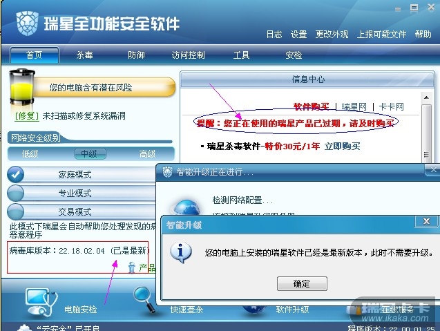 提示过期应该不在那个信息中心提示的,楼主不用担心过期问题,如果瑞星弹出过期界面说过期才是真正的过期.