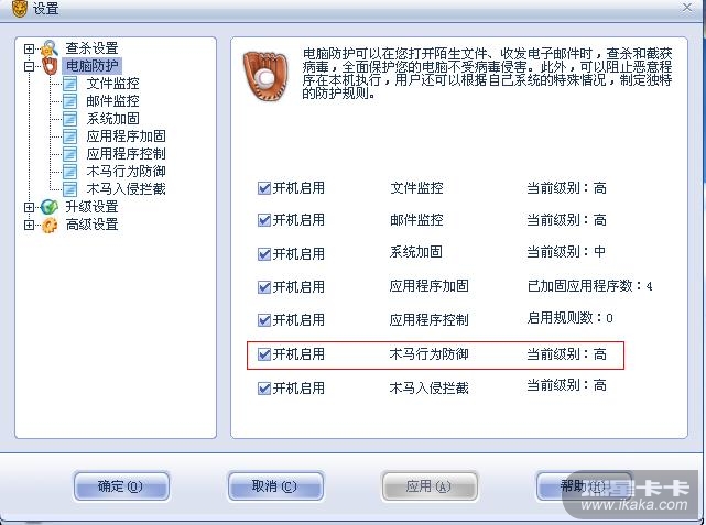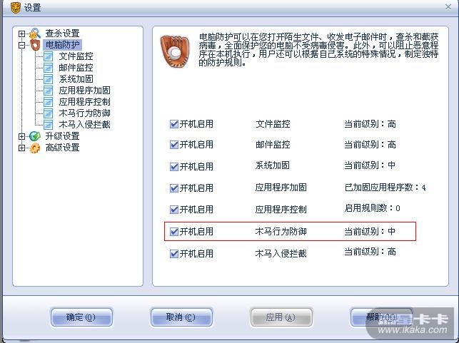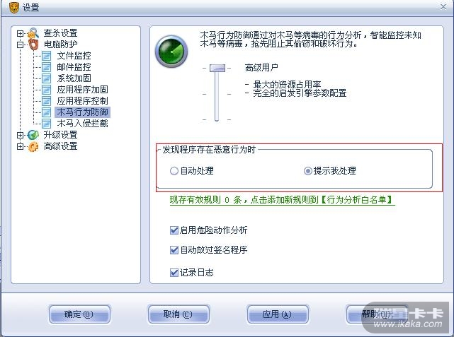 在如下图的两个模式间切换时,会造成“木马行为防御”的安全级别变化(见图2~4)。